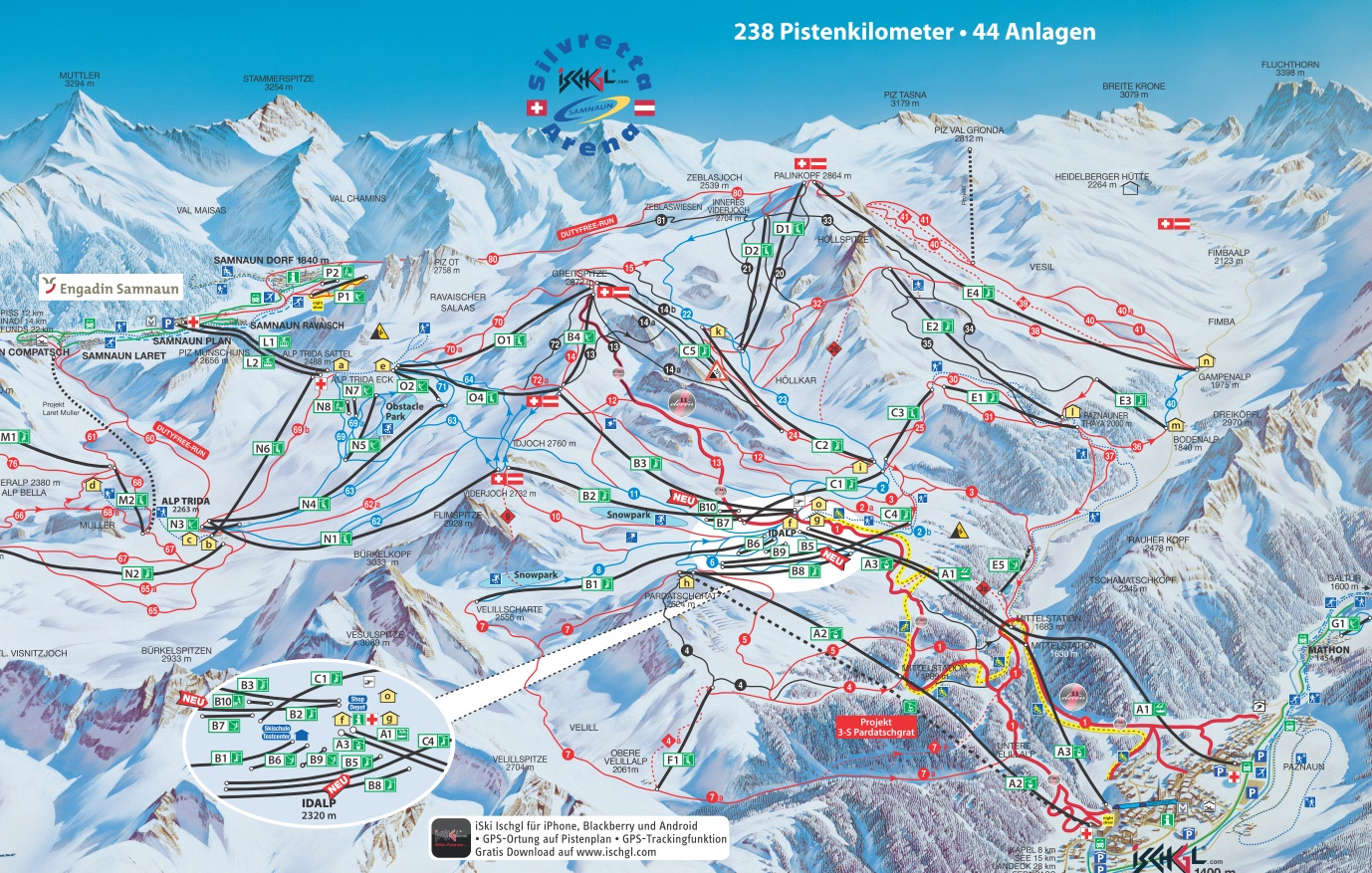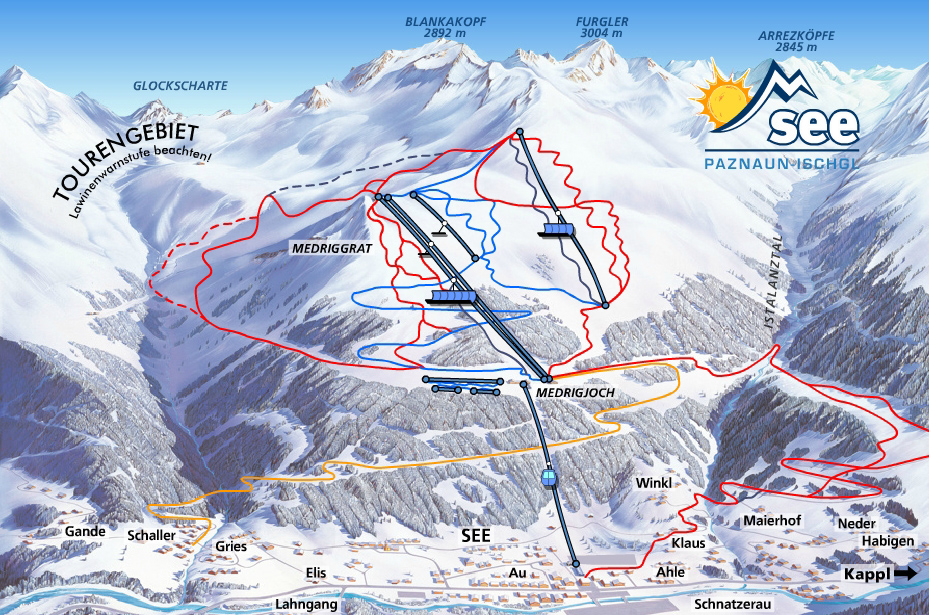 Kappl: Höhe: 1180 m - 2690 m Piste: 45 km Lifte: 10 Skigebietsplan: Kappl Ischgl: Höhe: 1377 m - 2867 m Piste: 238 km Lifte: 45 Skigebietsplan: Ischgl Galtür: Höhe: 1600 m - 2300 m Piste: 40 km Lifte: 16 Skigebietsplan: Galtür See: Höhe: 1050 m - 2450 m Piste: 41 km Lifte: 5 Skigebietsplan: See Schneesicherheit in Ischgl von Dezember bis Mai Skipass