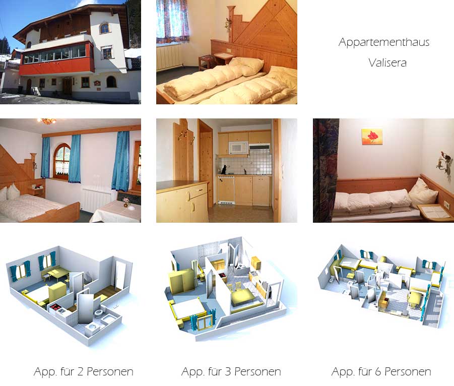 Die Appartements im Haus Valisera sind komplett ausgestattet und bieten großzügig Platz für 2-6 Personen. Alle Appartements verfügen über ein eigenes Bad mit Dusche/WC, Küche zur Selbstverpflegung und W-LAN.