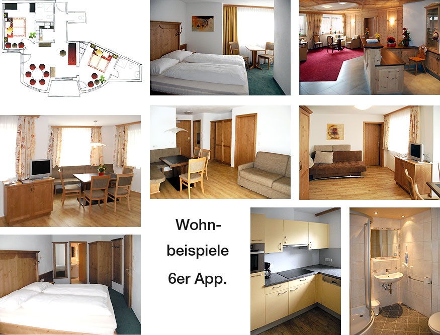 Die Alpenperle wurde zum Winter 2007/2008 komplett neu gebaut.Auch in der kommenden Saison bieten wir unseren Gästen dieses Appartementhaus wieder exklusiv an. Den Standard des Hauses kann man als exzellent bezeichnen, denn mit kleiner Lounge im Eingangsbereich, Rezeption, W-LAN, Fahrstuhl, Skiraum mit Skischuh-Heizung und PKW Tiefgarage findet man in der Alpenperle alles, was ein zeitgemäßes Appartementhaus auszeichnet. Die 11 Komfort-Appartements sind neu und modern eingerichtet, voll ausgestattet und bieten auf großzügigen 30-80 m² Platz für 4, 6 und 8 Personen. Jedes Schlafzimmer besitzt ein eigenes Bad mit Du/WC, ein weiteres WC (außer 4er App.) sorgt für zusätzlichen Komfort z. B. für die Gäste, die im Wohnbereich schlafen. Weiterhin verfügt jedes Appartement über Sat-TV im Wohnbereich, eine funktionale Kochecke sowie großteils über einen Balkon. ![]() Kat. A: 4er App. (Bilder hier klicken) mit 1 Doppelzimmer mit Du/WC, Wohnbereich mit Schlafcouch für 2 Personen, Kochnische, Balkon. Kat. B: 6er App. (Bilder hier klicken) mit 2 Doppelzimmern jeweils mit Du/WC, Wohnbereich mit Schlafcouch für 2 Personen, Kochnische, z.T. weiteres WC, großteils Balkon.
